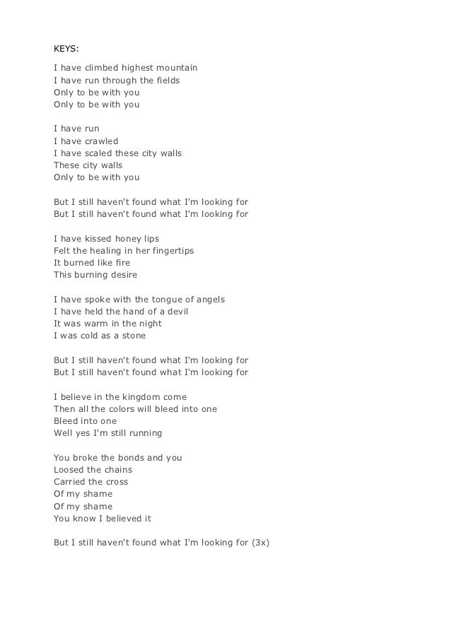 But I still haven't found what I'm looking for But I still haven't found what I'm looking for I believe in the kingdom come Then all the colors will bleed into one Bleed into one Well yes I'm still running You broke the bonds and you Loosed the chains Carried the cross Of my shame Of my shame You know I believed it But I still haven't found what I'm looking forI Still Haven't Found What I'm Looking For by U2 Album The Joshua Tree Charted 6 1 Get the Sheet Music License This Song lyrics artistfacts Songfacts® The lyrics could refer to a search for spiritual enlightenment or a search for love In an interview with Rolling Stone magazine,I have climbed the highest mountains I have run through the fields Only to be with you Only to be with you I have run, I have crawled I have scaled these city walls These city walls Only to be with you But I still haven't found What I'm looking for But I still haven't found What I'm looking for I have kissed honey lips Felt the healing in her fingertips It burned like fire This burning desire I have spoke with the tongue of angels I have held the hand of a devil It was warm in the night I